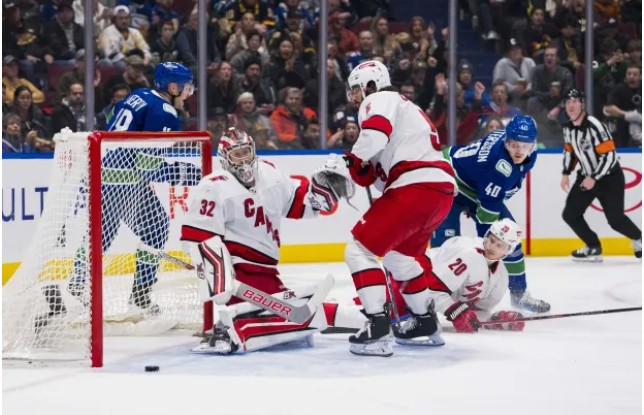 The Canucks were more focused in their game against Carolina, outshooting their opponents 13-7 in the first period, with the Hurricanes only managing two shots on goal in the last 1:27 of the period when they had a man advantage. Vancouver took the lead in the first period when Sam Lafferty scored off an Elias Pettersson shot. Pettersson then assisted Ilya Mikheyev’s goal in the second period to extend the Canucks’ lead to 2-0, but the Hurricanes responded quickly with a goal from Jordan Martinook. J.T. Miller scored for the Canucks to make it 3-1, but Brady Skjei’s last-minute goal kept the Hurricanes in the game. Stefan Noesen tied the game at 3-3 early in the third period before Pettersson scored the game-winning goal with a wraparound effort. Despite the win, Hurricanes coach Rod Brind’Amour criticized his team’s missed coverage on the earlier goals and said they didn’t play to their potential. The Hurricanes won the special-teams battle but are struggling in the standings and have the worst team save percentage in the league.